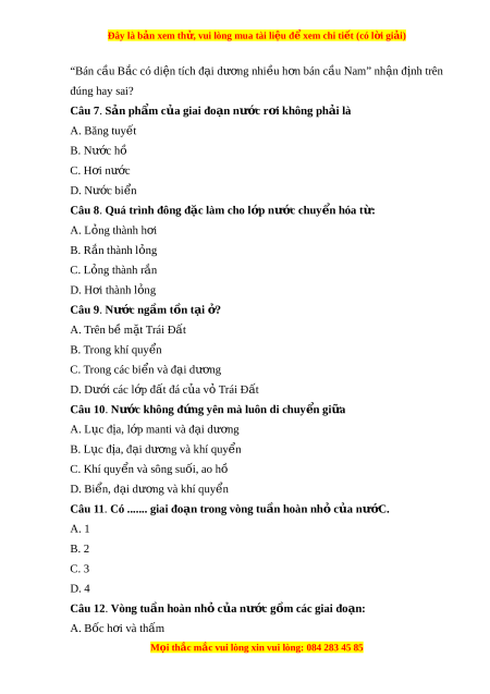 Câu 10. Nư c không đ ớ ng yên m ứ à luôn di chuy n gi ể a ữ A. L c ụ đ a, ị l p m ớ anti và đ i ạ dư ng ơ B. L c đ ụ ịa, đ i ạ dư ng ơ và khí quy n ể C. Khí quy n và ể sông su i ố , ao hồ D. Bi n, đ ể i ạ dư ng và khí ơ quy n ể
