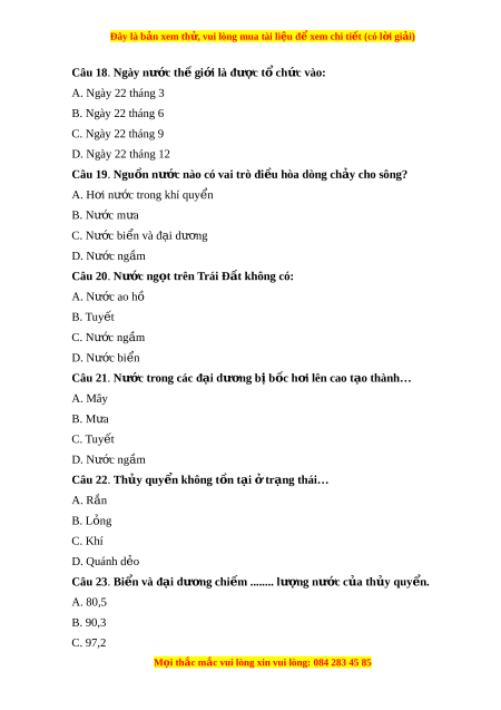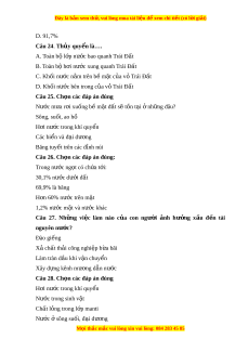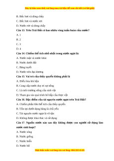 Câu 18. Ngày nước th g ế i i ớ là đư c ợ t ch ổ c vào ứ : A. Ngày 22 tháng 3 B. Ngày 22 tháng 6 C. Ngày 22 tháng 9 D. Ngày 22 tháng 12 Câu 19. Ngu n n ồ ư c nào có vai ớ