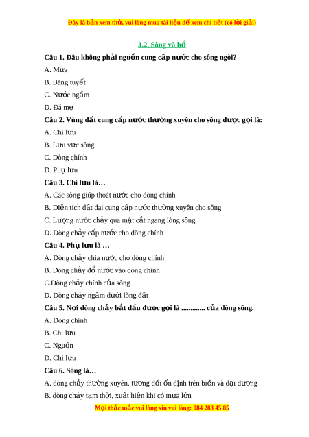 A. Các sông giúp thoát nư c ớ cho dòng chính B. Di n t ệ ích đ t ấ đai cung c p n ấ ư c ớ thư ng ờ xuyên cho sông C. Lư ng n ợ ư c ớ ch y qua ả m t ặ c t ắ ngang lòng sông D. Dòng ch y ả c p n ấ ước cho dòng chính Câu 4. Phụ l u l ư à … A. Dòng ch y ả chia nư c cho ớ dòng chính B. Dòng ch y đ ả ổ nư c vào dòng chí ớ nh C.Dòng ch y chí ả nh c a ủ sông D. Dòng ch y ả ng m ầ dư i ớ lòng đ t ấ Câu 5. N i ơ dòng ch y b ả t ắ đ u đ ầ ư c g ợ i