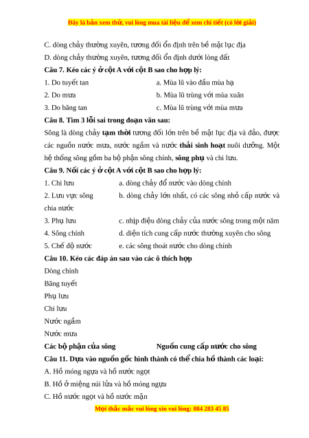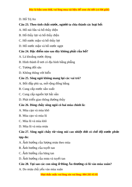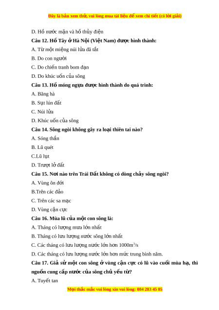 Đây là bản xem th , vu ử i lòng mua tài li u ệ đ xe ể m chi ti t ế (có l i ờ gi i ả ) D. Hồ nư c m ớ n ặ và hồ th y đi ủ n ệ Câu 12. H ồ Tây H ở à N i ộ (Vi t ệ Nam) đư c hì ợ nh thành: A. T m ừ t ộ miệng núi l a đã t ử t ắ B. Do con ngư i ờ C. Do chi n ế tranh bom đ n ạ D. Do khúc uốn c a s ủ ông Câu 13. H m ồ óng ng a đ ự ư c hì ợ