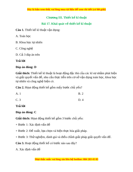 Bài 17. Khái quát v t ề hi t ế k k ế ĩ thu t ậ Câu 1. Thi t ế k kĩ ế thu t ậ v n ậ d ng: ụ A. Toán h c ọ B. Khoa h c t ọ nhi ự ên C. Công nghệ D. C 3 đáp án ả trên Trả l i ờ Đáp án đúng: D Giải thích: Thi t ế k kĩ ế thu t ậ là ho t ạ đ ng đ ộ ặc thù c a ủ các kĩ sư nh m ằ phát hi n ệ và gi i ả quy t ế v n đ ấ , nhu c ề u t ầ h c t ự i n t ễ rên c s ơ v ở n d ậ ng t ụ oán h c, khoa h ọ c ọ t nhi ự ên và công ngh hi ệ n có. ệ Câu 2. H at ọ đ ng t ộ hi t ế k g ế m ồ m y b ấ ư c ớ ch y ủ u? ế A. 1 B. 2 C. 3 D. 4 Trả l i ờ Đáp án đúng: C Giải thích: H at ọ đ ng t ộ hi t ế kế gồm 3 bư c ớ ch y ủ u: ế + Bư c 1: ớ Xác đ nh v ị n đ ấ ề + Bư c 2: ớ Đ xu ề ất, l a ch ự n ọ và hi n t ệ h c hóa gi ự i ả pháp. + Bư c 3: ớ Th nghi ử ệm, đánh giá và đi u ch ề ỉnh gi i ả pháp gi i ả quy t ế v n đ ấ . ề Câu 3. Ho t ạ đ ng t ộ hi t ế k có b ế ư c ớ nào sau đây? A. Xác đ nh v ị n đ ấ ề M i