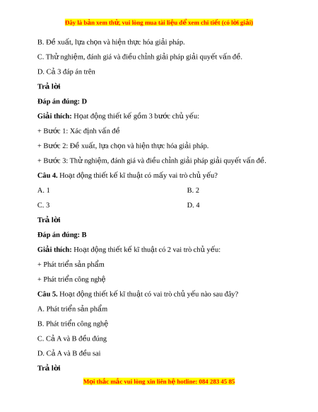 Đây là bản xem th , vu ử i lòng mua tài li u ệ đ xe ể m chi ti t (c ế ó l i ờ gi i ả ) B. Đ xu ề ất, l a ch ự n và hi ọ n t ệ h c hóa ự gi i ả pháp. C. Th nghi ử m ệ , đánh giá và đi u ch ề nh gi ỉ i ả pháp gi i ả quy t ế v n đ ấ . ề D. C 3 đáp án ả trên Trả l i ờ Đáp án đúng: D Giải thích: H at ọ đ ng t ộ hi t ế kế gồm 3 bư c ớ ch y ủ u: ế + Bư c 1: ớ Xác đ nh v ị n đ ấ ề + Bư c 2: ớ Đ xu ề ất, l a ch ự n ọ và hi n t ệ h c hóa gi ự i ả pháp. + Bư c 3: ớ Th nghi ử ệm, đánh giá và đi u ch ề ỉnh gi i ả pháp gi i ả quy t ế v n đ ấ . ề Câu 4. Ho t ạ đ ng t ộ hi t ế k kĩ ế thu t ậ có m y vai ấ trò ch y ủ u? ế A. 1 B. 2 C. 3 D. 4 Trả l i ờ Đáp án đúng: B Giải thích: Ho t ạ đ ng ộ thi t ế kế kĩ thu t ậ có 2 vai trò ch y ủ u: ế + Phát tri n s ể n ả ph m ẩ + Phát tri n công ngh ể ệ Câu 5. Ho t ạ đ ng t ộ hi t ế k kĩ ế thu t ậ có vai trò ch y ủ u ế nào sau đây? A. Phát tri n s ể n ả ph m ẩ B. Phát tri n công ngh ể ệ C. Cả A và B đ u đúng ề D. C ả A và B đ u s ề ai Trả l i ờ M i