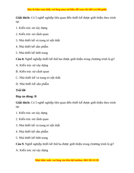 Giải thích: Có 5 ngh nghi ề p l ệ iên quan đ n t ế hi t ế kế đư c gi ợ i ớ thi u t ệ heo trình t : ự 1. Ki n t ế rúc sư xây d ng ự 2. Ki n t ế rúc sư c nh quan ả 3. Nhà thi t ế kế và trang trí n i ộ th t ấ 4. Nhà thi t ế kế s n ả ph m ẩ 5. Nhà thi t ế kế th i ờ trang Câu 8. Nghề nghi p t ệ hi t ế k t ế h hai ứ đư c gi ợ i ớ thi u t ệ rong chư ng ơ trình là gì? A. Ki n ế trúc sư xây d ng ự B. Ki n t ế rúc s c ư nh ả quan C. Nhà thi t ế k và t ế rang trí n i ộ th t ấ D. Nhà thi t ế k s ế n ả ph m ẩ Trả l i ờ Đáp án đúng: B