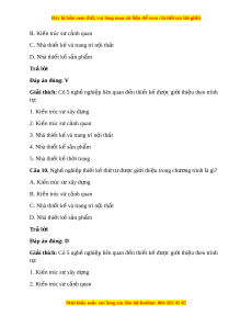 Giải thích: Có 5 ngh nghi ề p l ệ iên quan đ n t ế hi t ế kế đư c gi ợ i ớ thi u t ệ heo trình t : ự 1. Ki n t ế rúc sư xây d ng ự 2. Ki n t ế rúc sư c nh quan ả 3. Nhà thi t ế kế và trang trí n i ộ th t ấ 4. Nhà thi t ế kế s n ả ph m ẩ 5. Nhà thi t ế kế th i ờ trang Câu 9. Nghề nghi p t ệ hi t ế k t ế h ba ứ đư c gi ợ i ớ thi u t ệ rong chư ng t ơ rình là gì? A. Ki n ế trúc sư xây d ng ự M i