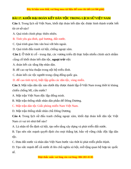 Đây là bản xem th , vu ử i lòng mua tài li u ệ đ xe ể m chi ti t (c ế ó l i ờ gi i ả ) BÀI 17. KH I Ố ĐẠI ĐOÀN K T Ế DÂN T C Ộ TRONG L C Ị H S Ử VI T Ệ NAM Câu 1. Trong l ch ị sử Vi t ệ Nam, kh i ố đ i ạ đoàn k t ế dân t c ộ đư c ợ hình thành trư c ớ h t ế t c ừ ơ sở nào? A. Quá trình chinh ph c t ụ hiên nhiên.