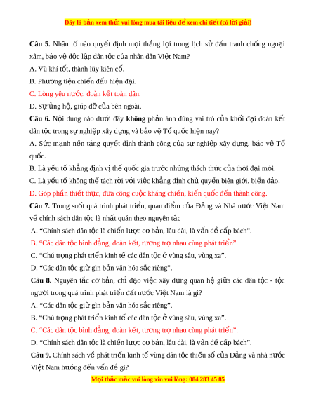A. Vũ khí tốt, thành lũy kiên c . ố B. Phư ng t ơ i n chi ệ n đ ế u hi ấ n đ ệ i ạ . C. Lòng yêu nư c, ớ đoàn k t ế toàn dân. D. S ự ng ủ h , gi ộ úp đ c ỡ a bên ủ ngoài. Câu 6. N i ộ dung nào dư i ớ đây không ph n ả ánh đúng vai trò c a ủ kh i ố đ i ạ đoàn k t ế dân t c ộ trong sự nghi p xây d ệ ng và b ự o ả v ệ T qu ổ c hi ố n nay? ệ A. S c ứ m nh ạ n n ề t ng ả quy t ế đ nh ị thành công c a ủ sự nghi p ệ xây d ng, ự b o ả vệ Tổ quốc. B. Là y u ế t kh ố ng ẳ đ nh v ị t ị h qu ế c gi ố a trư c nh ớ ng t ữ hách th c c ứ a t ủ h i ờ đ i ạ m i ớ . C. Là y u ế t không t ố h t ể ách r i ờ v i ớ vi c kh ệ ng ẳ đ nh ch ị quy ủ n bi ề ên gi i ớ , bi n đ ể o. ả D. Góp phần thi t ế th c, đ ự a ư công cu c kháng ộ chi n, ki ế n qu ế c đ ố n t ế hành công. Câu 7. Trong su t ố quá trình phát tri n, ể quan đi m ể c a ủ Đ ng ả và Nhà nư c ớ Vi t ệ Nam v chí ề nh sách dân t c l ộ à nh t ấ quán theo nguyên t c ắ A. “Chính sách dân t c l ộ à chi n ế lư c c ợ b ơ n, ả lâu dài, là v n đ ấ c ề p bách”. ấ B. “Các dân t c bì ộ nh đ ng, ẳ đoàn k t ế , tư ng t ơ r nhau cùng phát ợ tri n”. ể C. “Chú tr ng phát ọ tri n ki ể nh t các dân t ế c ộ vùng s ở âu, vùng xa”. D. “Các dân t c ộ gi gì ữ n b n văn hóa ả s c ắ riêng”. Câu 8. Nguyên t c ắ cơ b n, ả chỉ đ o ạ vi c ệ xây d ng ự quan hệ gi a ữ các dân t c ộ - t c ộ ngư i