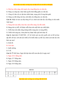 Câu 12. Ở Việt Nam, Ngày h i ộ đ i ạ đoàn k t ế toàn dân t c ộ là ngày nào? A. Ngày 18/11 h ng ằ năm. B. Ngày 27/7 h ng năm ằ . C. Ngày 25/6 h ng năm ằ . D. Ngày 18/3 h ng năm ằ . ĐÁP ÁN 1 2 3 4 5 6 7 8 9 10 B D C B C D B C A A 11 12 M i ọ thắc m c