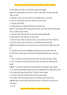 Câu 9: Vì sao Khúc Th a ừ D ch ụ x ỉ ng t ư i t ế đ s ộ ứ mà không x ng v ư ư ng? ơ A. Do muốn l i ợ d ng danh nghĩ ụ a quan l i ạ nhà Đư ng đ ờ xây d ể ng ự n n t ề ch ự ủ B. Do nhân dân không ng h ủ K ộ húc Th a ừ D x ụ ng v ư ư ng ơ C. Do Khúc Th a D ừ không đ ụ t ủ h c ự l c đ ự x ể ng v ư ư ng ơ D. Do Khúc Th a D ừ ụ không muốn t o ạ ra kho ng ả cách v i ớ nhân dân Câu 10: Nhân v t ậ nào đư c ợ đánh giá là nhà c i ả cách đ u t ầ iên trong l ch s ị ử Việt Nam? A. Lý Bí M i