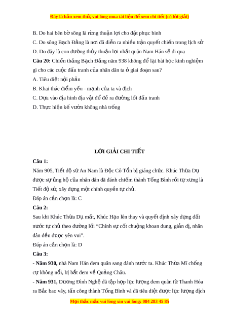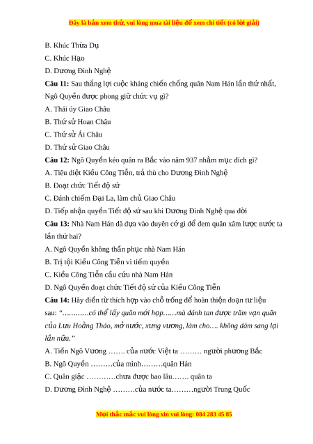 Đây là bản xem th , vu ử i lòng mua tài li u ệ đ xe ể m chi ti t ế (có l i ờ gi i ả ) B. Khúc Th a D ừ ụ C. Khúc H o ạ D. Dư ng Đ ơ ình Nghệ Câu 11: Sau th ng l ắ i ợ cu c ộ kháng chi n ch ế ống quân Nam Hán l n t ầ h nh ứ t ấ , Ngô Quy n đ ề ư c ợ phong gi ch ữ c v ứ gì ụ ? A. Thái úy Giao Châu B. Th s ứ ử Hoan Châu C. Th s ứ ử Ái Châu D. Th s ứ G ử iao Châu Câu 12: Ngô Quy n ề kéo quân ra B c ắ vào năm 937 nh m ằ m c ụ đích gì? A. Tiêu di t ệ Ki u C ề ông Ti n, t ễ rả thù cho Dư ng Đ ơ ình Nghệ B. Đo t ạ ch c ứ Ti t ế độ sứ C. Đánh chi m ế Đ i ạ La, làm ch G ủ iao Châu D. Ti p nh ế n ậ quy n ề Ti t ế đ s ộ s ứ au khi Dư ng Đ ơ ình Ngh qua đ ệ i ờ