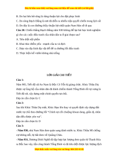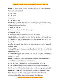 Câu 17: Kế ho ch đánh gi ạ c ặ Nam Hán c a ủ Ngô Quy n có đi ề m ể gì đ c ộ đáo? A. Dùng k m ế ai ph c hai ụ bên b s ờ ông sau đó t n công t ấ r c ự di n vào ệ các con thuy n l ề n. ớ B. Bố trí tr n ậ đ a m ị ai ph c ụ t ở t ấ c các đo ả n ạ đư ng chúng có t ờ h đi ể qua đ ể đánh b i ạ kẻ thù C. Dùng kế đóng c c t ọ rên khúc sông hi m ể y u, ế nh đ ử ch vào t ị r n ậ đ a bãi ị c c ọ rồi đánh b i ạ chúng D. Mở tr n ậ đánh quy t ế đ nh đánh b ị i ạ quân đ ch, r ị i ồ gi ng ả hòa, m đ ở ư ng ờ cho chúng rút về nư c ớ Câu 18: Chi n ế th ng B ắ ch Đ ạ ng