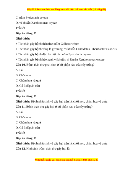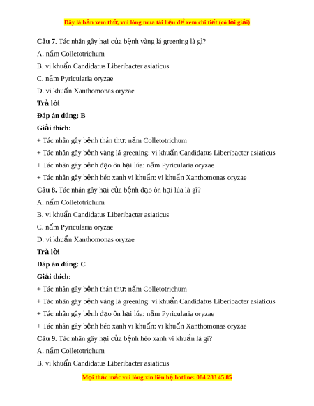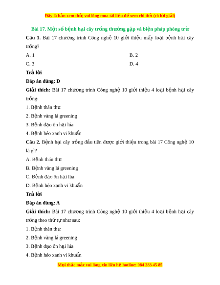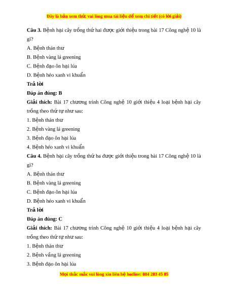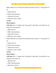 Đây là bản xem th , vu ử i lòng mua tài li u ệ đ xe ể m chi ti t (c ế ó l i ờ gi i ả ) Câu 3. Bệnh h i ạ cây tr ng ồ thứ hai đư c ợ gi i ớ thi u ệ trong bài 17 Công ngh ệ 10 là gì? A. Bệnh thán thư B. B nh vàng l ệ á greening C. B nh đ ệ o ôn h ạ i ạ lúa D. Bệnh héo xanh vi khu n ẩ Trả l i ờ Đáp án đúng: B
