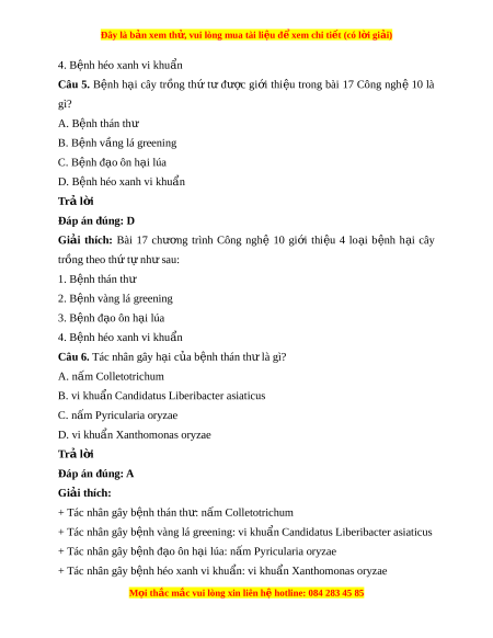 Đây là bản xem th , vu ử i lòng mua tài li u ệ đ xe ể m chi ti t (c ế ó l i ờ gi i ả ) 4. Bệnh héo xanh vi khu n ẩ Câu 5. Bệnh h i ạ cây tr ng ồ thứ tư đư c ợ gi i ớ thi u ệ trong bài 17 Công ngh ệ 10 là gì? A. Bệnh thán thư B. B nh v ệ ng l ầ á greening C. B nh đ ệ o ôn h ạ i ạ lúa D. Bệnh héo xanh vi khu n ẩ Trả l i ờ Đáp án đúng: D