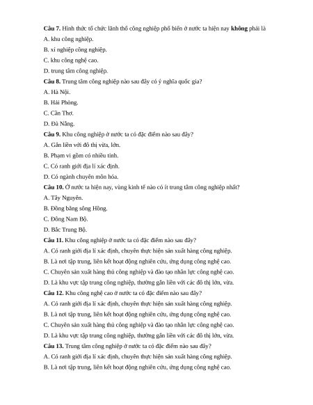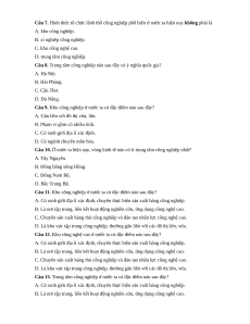 Câu 7. Hình thức tổ chức lãnh thổ công nghiệp phổ biến ở nước ta hiện nay không phải là A. khu công nghiệp.