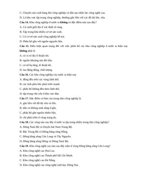 Câu 16. Các khu công nghiệp của nước ta hiện nay