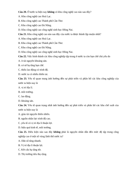 Câu 20. Ở nước ta hiện nay không có khu công nghệ cao nào sau đây?