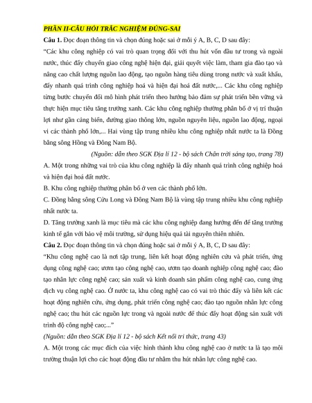 Trắc nghiệm Bài 17: Tổ chức lãnh thổ công nghiệp Địa lí 12 Đúng-Sai, Trả lời ngắn sách mới 2025