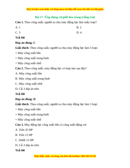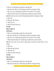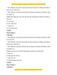 Đây là bản xem th , vu ử i lòng mua tài li u ệ đ xe ể m chi ti t (c ế ó l i ờ gi i ả ) + Máy đ ng ộ l c ự công su t ấ trung bình phù h p ợ s ử d ng ụ trên nh ng ữ cánh đ ng ồ có diện tích t 1 đ ừ n 20 ha ế + Máy đ ng ộ l c ự công su t ấ nhỏ phù h p ợ sử d ng ụ trên nh ng ữ cánh đ ng ồ có di n ệ tích dư i ớ 1 ha Câu 8. Máy đ ng ộ l c ự công su t ấ nhỏ phù h p ợ sử d ng ụ trên nh ng ữ cánh đ ng ồ có diện tích: A. Trên 20 ha B. T 1 đ ừ n 20 ha ế C. Dư i ớ 1 ha D. C 3 đáp án ả trên Trả l i ờ Đáp án đúng: C Giải thích: + Máy đ ng ộ l c ự công su t ấ l n ớ phù h p ợ sử d ng ụ trên nh ng ữ cánh đ ng ồ có di n ệ tích trên 20 ha + Máy đ ng ộ l c ự công su t ấ trung bình phù h p ợ s ử d ng ụ trên nh ng ữ cánh đ ng ồ có diện tích t 1 đ ừ n 20 ha ế + Máy đ ng ộ l c ự công su t ấ nhỏ phù h p ợ sử d ng ụ trên nh ng ữ cánh đ ng ồ có di n ệ tích dư i ớ 1 ha Câu 9. Lo i ạ máy nào sau đây là ng ứ d ng c ụ gi ơ i ớ hóa trong làm đ t ấ ? A. Máy cày B. Máy gieo h t ạ c m ầ tay C. Máy x i ớ , vun D. Máy thu ho ch ạ khoai tây Trả l i ờ Đáp án đúng: A Giải thích: M i