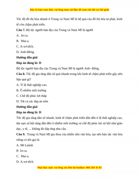 Câu 9. Trung và Nam Mĩ gia thoa của nhiều nền văn hóa, tạo nên bản sắc văn hóa riêng có tên gọi là A. Mĩ Latinh B In-ca. C. Mai-a. D. A-xơ-tếch.