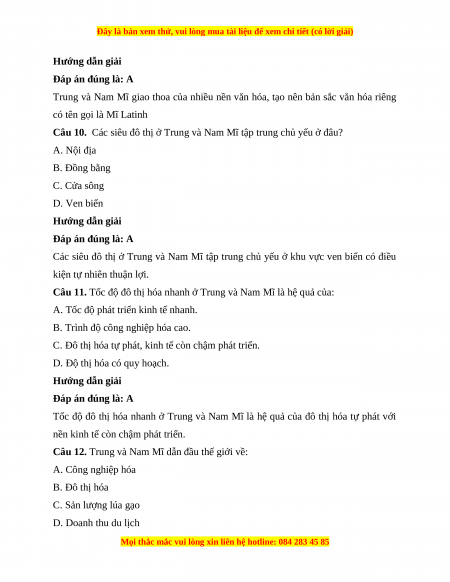 Câu 12. Trung và Nam Mĩ dẫn đầu thế giới về: A. Công nghiệp hóa B. Đô thị hóa C. Sản lượng lúa gạo D. Doanh thu du lịch