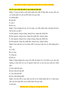 ể nào sau đây không đúng v i ớ các quy lu t ậ đ a ị lí chung c a ủ Trái Đất? A. Các quy lu t ậ đ a đ ị i ớ và phi đ a đ ị i ớ không có tác đ ng r ộ iêng r . ẽ B. Các quy lu t ậ đ a đ ị i ớ và phi đ a đ ị i ớ di n r ễ a đ ng t ồ h i ờ v i ớ nhau. C. Mỗi quy lu t ậ có vai trò ch ch ủ t ố trong t ng t ừ rư ng ờ h p c ợ t ụ h . ể D. Mỗi quy lu t ậ chi phối m nh t ạ t ấ cả các hư ng phát ớ tri n t ể nhi ự ên. Câu 13. Các đ i ớ khí h u ậ trên Trái Đ t ấ t ừ Xích đ o ạ v ề c c ự theo th ứ t ự nào sau đây? A. Nhiệt đ i ớ , c n xí ậ ch đ o, ạ c n ậ c c. ự B. Xích đ o, ạ nhi t ệ đ i ớ , ôn đ i ớ , c c. ự C. Nhiệt đ i ớ , xích đ o, ôn đ ạ i ớ , c c. ự D. C n ậ nhi t ệ , c n xí ậ ch đ o, ạ c n c ậ c. ự Câu 14. Quy lu t ậ đ a ị ô là s ự thay đ i ổ có tính quy lu t ậ c a ủ các đ i ố tư ng ợ đ a ị lí theo A. vĩ đ . ộ B. độ cao. C. các mùa. D. kinh đ . ộ