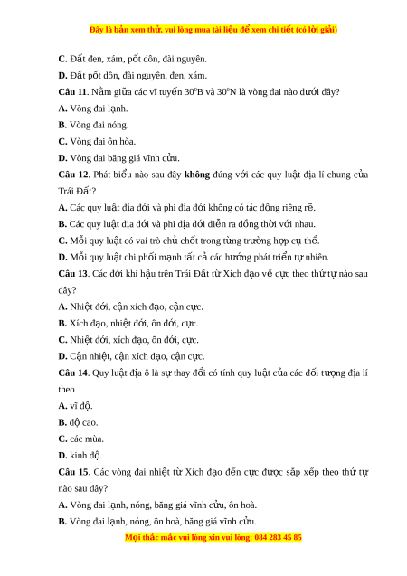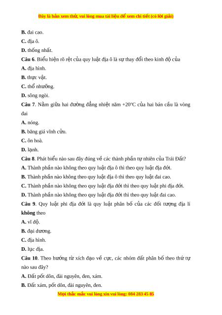 Đây là bản xem th , vu ử i lòng mua tài li u ệ đ xe ể m chi ti t (c ế ó l i ờ gi i ả ) B. đai cao. C. địa ô. D. thống nhất. Câu 6. Bi u ể hi n r ệ õ r t ệ c a ủ quy lu t ậ đ a ô l ị à sự thay đ i ổ theo kinh đ c ộ a ủ A. địa hình. B. th c v ự t ậ . C. thổ như ng. ỡ D. sông ngòi. Câu 7. N m ằ gi a ữ hai đư ng ờ đ ng ẳ nhi t ệ năm +20oC c a ủ hai bán c u ầ là vòng đai A. nóng.