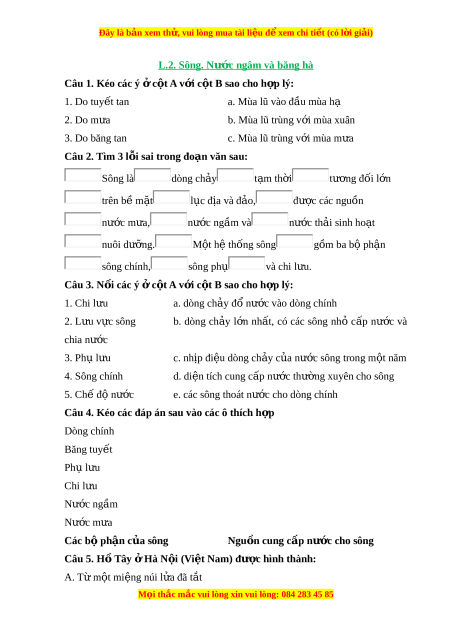 ỗ sai trong đo n văn s ạ au: Sông là dòng ch y ả t m ạ th i ờ tư ng đ ơ ối l n ớ trên b m ề t ặ l c đ ụ ịa và đ o, ả đư c ợ các nguồn nư c ớ m a, ư nư c ng ớ ầm và nư c t ớ h i ả sinh ho t ạ nuôi dư ng. ỡ M t ộ hệ thống sông gồm ba b ph ộ n ậ sông chính, sông phụ và chi l u. ư Câu 3. N i ố các ý ở c t ộ A v i ớ c t ộ B sao cho h p l ợ ý: 1. Chi l u ư a. dòng ch y ả đổ nư c ớ vào dòng chính 2. L u v ư c ự sông b. dòng ch y ả l n ớ nh t ấ , có các sông nhỏ c p ấ nư c ớ và chia nư c ớ 3. Ph l ụ u ư c. nhịp điệu dòng ch y c ả a ủ nư c s ớ ông trong m t ộ năm 4. Sông chính d. diện tích cung c p n ấ ư c t ớ hư ng ờ xuyên cho sông 5. Ch đ ế ộ nư c ớ e. các sông thoát nư c ớ cho dòng chính