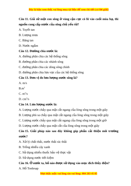 ờ phân chia các dòng sông chính D. đư ng phân chi ờ a l u v ư c c ự a ủ các h t ệ h ng s ố ông Câu 13. Đ n v ơ đo l ị u l ư ư ng ợ nư c ớ sông là? A. m/s B.m3 C. m3/s D. cm3/s Câu 14. Lưu lư ng ợ nư c ớ là: A. Lư ng ợ nư c ch ớ y ả qua m t ặ c t ắ ngang c a ủ lòng sông trong m t ộ giây B. Lư ng phù s ợ a ch y ả qua m t ặ c t ắ ngang c a l ủ òng sông trong m t ộ giây C. Lư ng n ợ ư c ớ ch y qua ả m t ặ c t ắ ngang c a l ủ òng sông trong m t ộ giờ D. Lư ng ợ nư c ch ớ y ả qua m t ặ c t ắ c a ủ lòng sông trong m t ộ giây