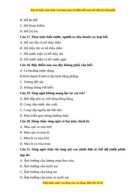 ờ ta chia thành các lo i ạ h : ồ A. Hồ núi l a ử và hồ th y ủ đi n ệ B. Hồ th y l ủ i ợ và hồ th y đi ủ ện C. Hồ nư c ớ m n và h ặ ồ th y l ủ i ợ D. Hồ nư c m ớ n ặ và hồ nư c ớ ng t ọ Câu 18. Đặc đi m