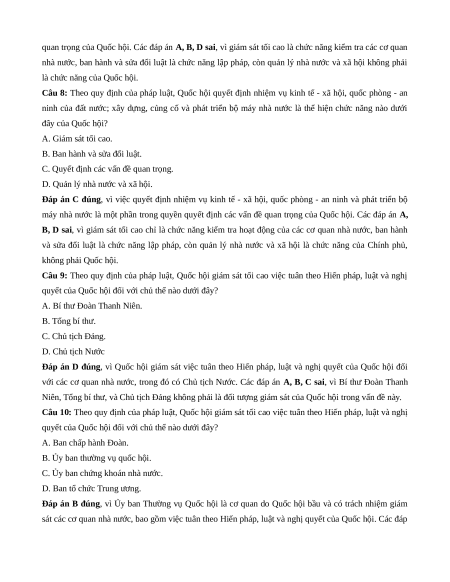Câu 9: Theo quy định của pháp luật, Quốc hội giám sát tối cao việc tuân theo Hiến pháp, luật và nghị