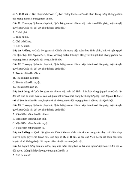 Câu 11: Theo quy định của pháp luật, Quốc hội giám sát tối cao việc tuân theo Hiến pháp, luật và nghị