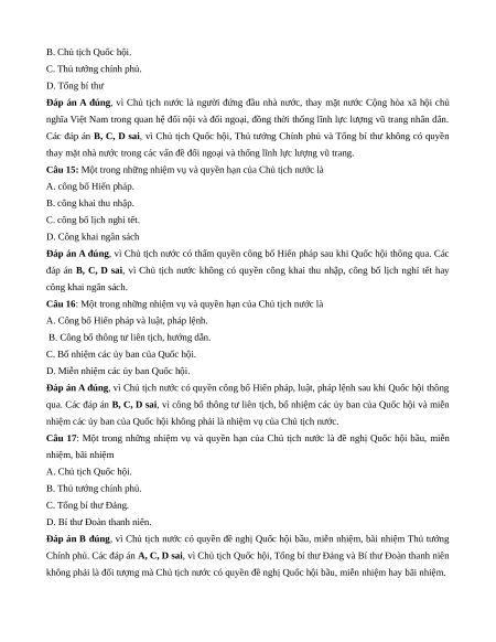 Câu 14: Người đứng đầu nhà nước, thay mặt nước Cộng hoà xã hội chủ nghĩa Việt Nam về đối nội và