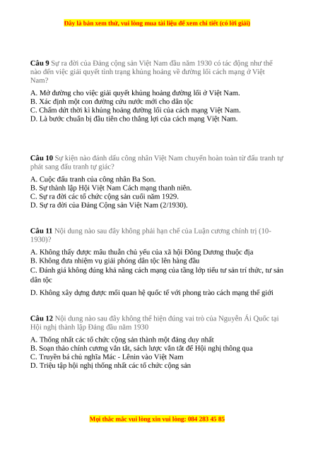 Câu 11 Nội dung nào sau đây không phải hạn chế của Luận cương chính trị (10- 1930)?