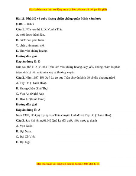 Trắc nghiệm Bài 18: Nhà Hồ và cuộc kháng chiến chống quân Minh xâm lược (1400-1407)