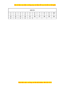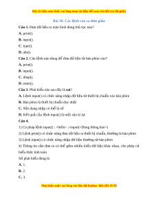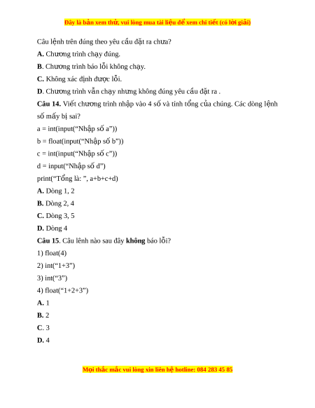Đây là bản xem th , vu ử i lòng mua tài li u ệ đ xe ể m chi ti t (c ế ó l i ờ gi i ả ) Câu l nh t ệ rên đúng theo yêu c u đ ầ t ặ ra ch a? ư A. Chư ng t ơ rình ch y đúng. ạ B. Chư ng ơ trình báo l i ỗ không ch y ạ . C. Không xác đ nh đ ị ược lỗi. D. Chư ng t ơ rình v n ch ẫ y ạ nh ng không đúng yêu c ư u đ ầ t ặ ra . Câu 14. Vi t ế chư ng ơ trình nh p ậ vào 4 s ố và tính t ng ổ c a ủ chúng. Các dòng l nh ệ số mấy bị sai? a = int(input(“Nh p ậ s a”) ố ) b = float(input(“Nh p ậ s b” ố )) c = int(input(“Nh p ậ s c”) ố ) d = input(“Nh p s ậ ố d”)