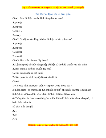 2) Lệnh print() có ch c năng ứ đ a d ư l ữ i u r ệ a thi t ế b chu ị n, t ẩ hư ng l ờ à bàn phím 3) Lệnh input() có ch c ứ năng nh p ậ d l ữ i u t ệ hư ng ờ t bàn phí ừ m 4) Thông tin c n ầ đ a ư ra có thể g m ồ nhi u ề ki u ể dữ li u ệ khác nhau, cho phép cả bi u t ể h c ứ tính toán Số phát bi u đúng l ể à A. 1. B. 2. C. 3. M i