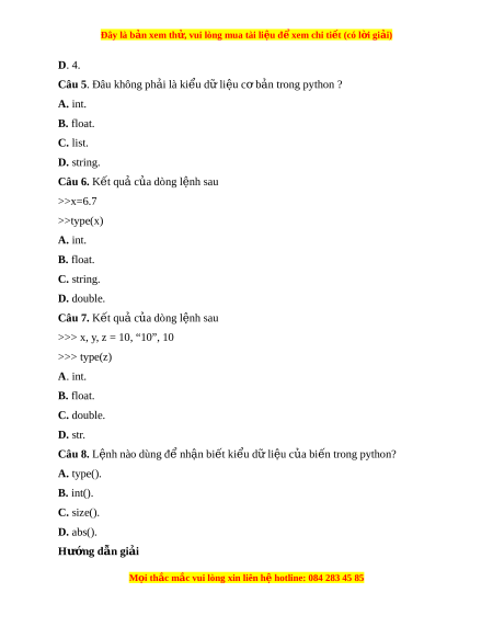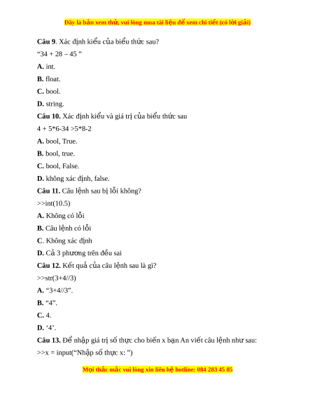 Đây là bản xem th , vu ử i lòng mua tài li u ệ đ xe ể m chi ti t (c ế ó l i ờ gi i ả ) Câu 9. Xác đ nh ki ị u ể c a bi ủ u t ể h c s ứ au? “34 + 28 – 45 ” A. int. B. float. C. bool. D. string. Câu 10. Xác đ nh ki ị u ể và giá tr c ị a ủ bi u ể th c s ứ au 4 + 5*6-34 >5*8-2 A. bool, True. B. bool, true. C. bool, False.