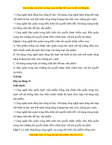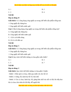 Đây là bản xem th , vu ử i lòng mua tài li u ệ đ xe ể m chi ti t (c ế ó l i ờ gi i ả ) Trả l i ờ Đáp án đúng: B Giải thích: + Công nghệ b o ả qu n ả l nh: ạ S n ả ph m ẩ tr ng ồ tr t ọ đư c ợ b o ả qu n ả trong kho l nh ạ v i ớ hệ th ng ố đi u ề hòa đi u ề khi n ể nhi t ệ độ l nh ạ thích h p ợ v i ớ t ng ừ lo i ạ s n ph ả ẩm. + Công nghệ l nh ạ đông làm s ng ố t ế bào: S ử d ng ụ công ngh ệ l nh ạ đông k t ế h p ợ v i ớ thi t ế b l ị àm tinh th n ể ư c ớ đóng băng d ở ng ạ h t ạ nh , t ỏ ròn, không góc c nh. ạ + Công nghệ b o ả qu n ả trong đi u ề ki n ệ khí quy n ể bi n ế đ i ổ : S ử d ng ụ màng ho c ặ túi b ng ằ ch t ấ d o đ ẻ b ể c ọ s n ả ph m ẩ + Công nghệ b o ả qu n ả trong đi u ề ki n ệ khí quy n ể đư c ợ ki m ể soát: B o ả qu n ả trong môi trư ng ờ khí quy n ể đư c đi ợ u ch ề nh khác ỉ v i ớ khí quy n t ể nhi ự ên. Câu 5. Công ngh b ệ o qu ả n ả trong đi u ki ề n khí ệ quy n bi ể n đ ế i ổ : A. S n ả ph m ẩ tr ng ồ tr t ọ đư c ợ b o ả qu n ả trong kho l nh ạ v i ớ hệ th ng ố đi u ề hòa đi u khi ề n nhi ể ệt đ l ộ nh ạ thích h p v ợ i ớ t ng l ừ o i ạ s n ả ph m ẩ . B. Sử d ng ụ công nghệ l nh ạ đông k t ế h p ợ v i ớ thi t ế bị làm tinh thể nư c ớ đóng băng ở d ng h ạ t ạ nh , t ỏ ròn, không góc c nh. ạ C. S d ử ng m ụ àng ho c ặ túi b ng ằ ch t ấ d o đ ẻ b ể c s ọ n ph ả m ẩ D. B o ả qu n ả trong môi trư ng ờ khí quy n ể đư c ợ đi u ề ch nh ỉ khác v i ớ khí quy n ể t nhi ự ên. Trả l i ờ Đáp án đúng: C Giải thích: + Công nghệ b o ả qu n ả l nh: ạ S n ả ph m ẩ tr ng ồ tr t ọ đư c ợ b o ả qu n ả trong kho l nh ạ v i ớ hệ th ng ố đi u ề hòa đi u ề khi n ể nhi t ệ độ l nh ạ thích h p ợ v i ớ t ng ừ lo i ạ s n ph ả ẩm. M i