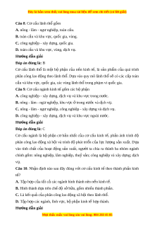 ố gia thành ba nhóm ngành chính g m ồ : nông nghi p, ệ lâm nghiệp, thuỷ s n; ả công nghi p ệ và xây d ng; ự d ch ị v . ụ H ộ gia đình là hình th c ứ tổ ch c ứ lãnh thổ nông nghi p. ệ Câu 6. C c ơ ấu thành ph n ki ầ nh t g ế ồm A. khu v c có v ự ốn đầu t n ư ư c ngoài ớ , nông - lâm - ng nghi ư p. ệ B. khu v c ự có vốn đ u t ầ n ư ư c ớ ngoài, công nghi p - ệ xây d ng. ự C. khu v c ki ự nh t t ế rong nư c, công nghi ớ p - ệ xây d ng, d ự ch v ị . ụ D. khu v c ki ự nh t t ế rong nư c, khu v ớ c ự có v n đ ố u t ầ n ư ư c ớ ngoài. Hư ng ớ d n gi ẫ i ả Đáp án đúng là: D Cơ cấu thành ph n ầ kinh t ế đư c ợ hình thành d a ự trên c ơ s ở ch ế đ ộ s ở h u ữ về tư li u ệ s n ả xu t ấ . Cơ c u ấ thành ph n ầ kinh t ế g m ồ khu v c ự kinh t ế trong nư c ớ và khu v c có v ự ốn đầu t n ư ư c ớ ngoài. Câu 7. N i ộ dung ch y ủ u ế nh t ấ c a ủ c c ơ u ki ấ nh t l ế à A. s s ự p x ắ p ế các b ph ộ n ậ trong c t ả ổng th chung. ể