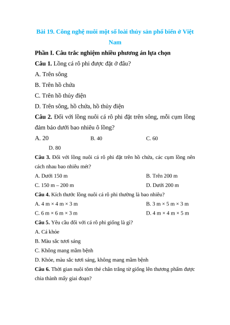 Câu 1. Lồng cá rô phi được đặt ở đâu? A. Trên sông B. Trên hồ chứa C. Trên hồ thủy điện