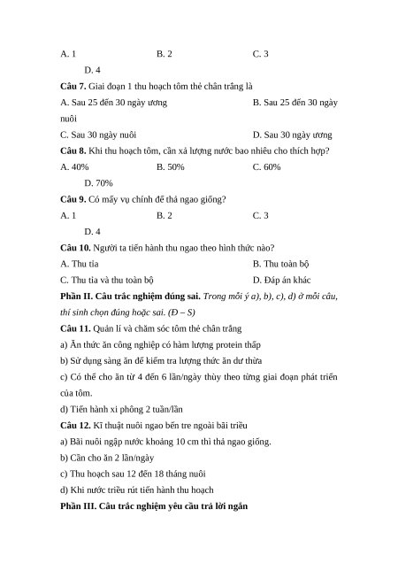 Câu 8. Khi thu hoạch tôm, cần xả lượng nước bao nhiêu cho thích hợp? A. 40% B. 50% C. 60% D. 70%