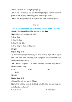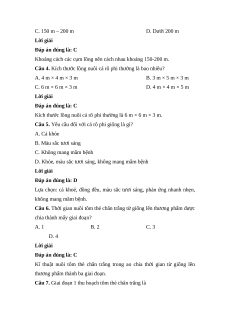 Câu 3. Đối với lồng nuôi cá rô phi đặt trên hồ chứa, các cụm lồng nên cách nhau bao nhiêu mét? A. Dưới 150 m B. Trên 200 m C. 150 m – 200 m D. Dưới 200 m