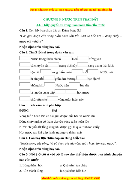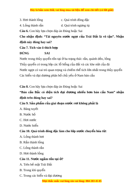 Đây là bản xem th , vu ử i lòng mua tài li u ệ đ xe ể m chi ti t ế (có l i ờ gi i ả ) 3. H i ơ thành l ng ỏ c. Quá trình đông đ c ặ 4. L ng t ỏ hành r n ắ d. Quá trình ng ng ư tụ Câu 6. Con hãy l a ự ch n đáp án Đ ọ úng hoặc Sai Cho nh n ậ đ nh