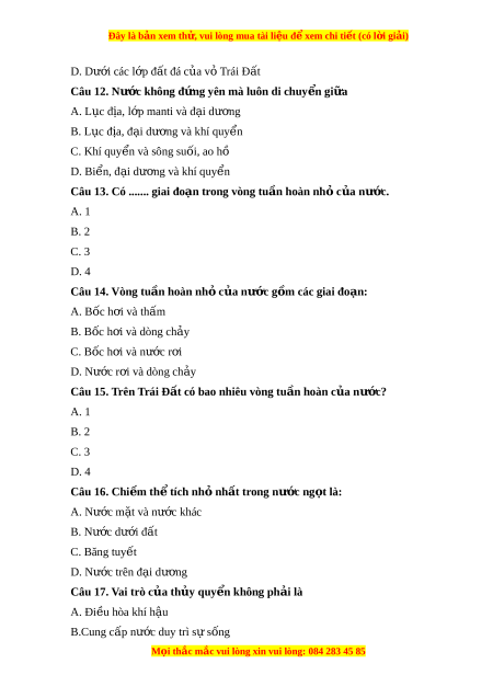 Câu 12. Nư c không đ ớ ng yên m ứ à luôn di chuy n gi ể a ữ A. L c ụ đ a, ị l p m ớ anti và đ i ạ dư ng ơ B. L c đ ụ ịa, đ i ạ dư ng ơ và khí quy n ể C. Khí quy n và ể sông su i ố , ao hồ D. Bi n, đ ể i ạ dư ng và khí ơ quy n ể