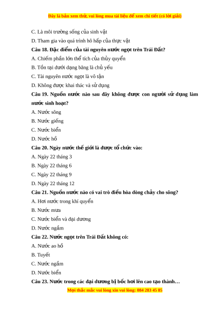 Câu 20. Ngày nước th g ế i i ớ là đư c ợ t ch ổ c vào ứ : A. Ngày 22 tháng 3 B. Ngày 22 tháng 6 C. Ngày 22 tháng 9 D. Ngày 22 tháng 12 Câu 21. Ngu n n ồ ư c nào có vai ớ