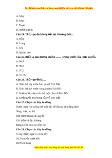 ấ có bao nhiêu vòng tu n hoàn c ầ a n ủ ư c? ớ A. 1 B. 2 C. 3 D. 4 Câu 16. Chi m ế th t ể ích nh nh ỏ t ấ trong nư c ớ ng t ọ là: A. Nư c m ớ t ặ và nư c ớ khác B. Nư c ớ dư i ớ đ t ấ C. Băng tuy t ế D. Nư c t ớ rên đ i ạ dư ng ơ Câu 17. Vai trò c a t ủ h y quy ủ n khô ể ng ph i ả là A. Đi u hòa khí ề h u ậ B.Cung c p n ấ ư c duy t ớ rì s s ự ng ố M i