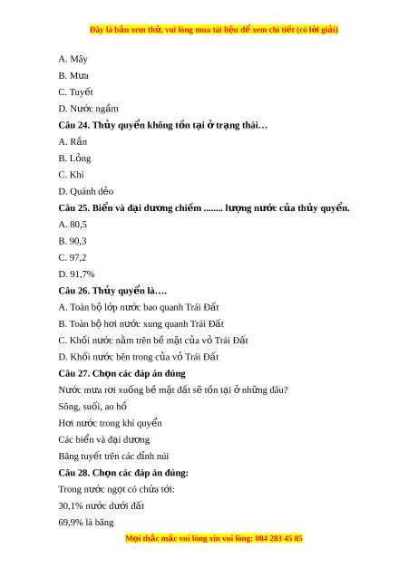 trò đi u hòa dòng ch ề y cho s ả ông? A. H i ơ nư c ớ trong khí quy n ể B. Nư c ớ m a ư C. Nư c ớ bi n và đ ể i ạ dư ng ơ D. Nư c ng ớ ầm Câu 22. Nư c ng ớ t ọ trên Trái Đ t ấ không có: A. Nư c ao ớ hồ B. Tuy t ế C. Nư c ớ ng m ầ D. Nư c bi ớ n ể Câu 23. Nư c t ớ rong các đ i ạ dư ng b ơ b ị c h ố i ơ lên cao t o t ạ hành… M i