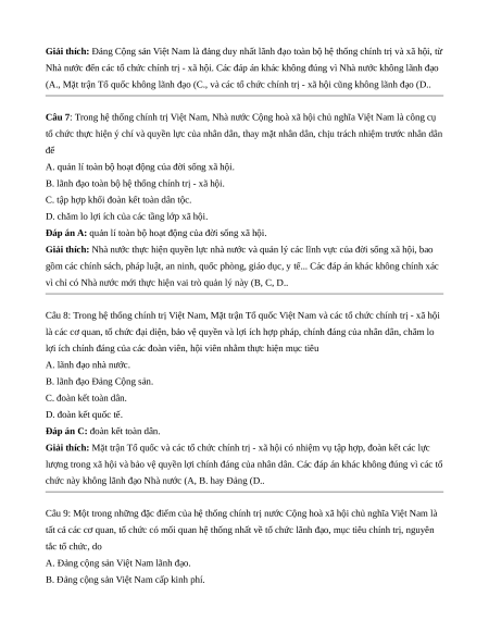Câu 9: Một trong những đặc điểm của hệ thống chính trị nước Cộng hoà xã hội chủ nghĩa Việt Nam là
