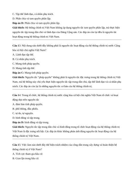 Câu 12: Nội dung nào dưới đây không phải là nguyên tắc hoạt động của hệ thống chính trị nước Cộng