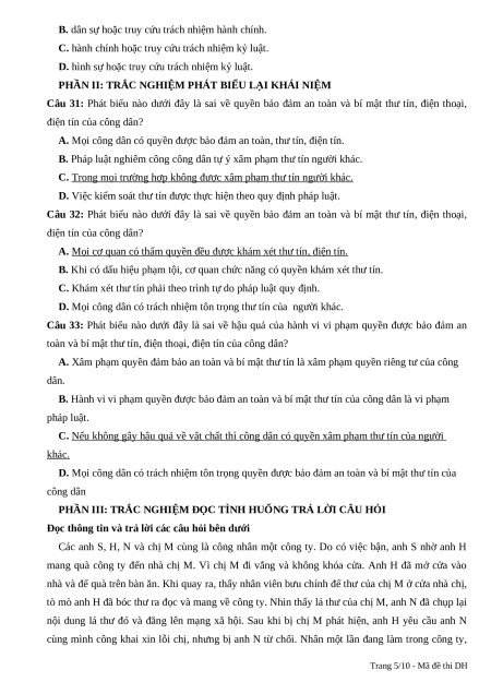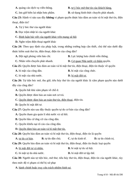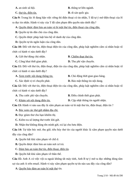 và bí mật thư tín, điện thoại, điện tín khi Trang 3/10 - Mã đề thi DH