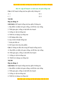 ể và diện tích gieo trồng, s đ ơ ồ khu v c t ự rồng 2. Th i ờ gian gieo, tr ng và d ồ ki ự n t ế hu ho ch ạ 3. Giống và v t ậ t t ư rồng tr t ọ 4. Thi t ế bị và d ng c ụ ụ trồng tr t ọ 5. Số lư ng nhân công ợ 6. Quy trình kĩ thu t ậ tr ng t ồ r t ọ 7. Kinh phí đ u t ầ ư 8. Kế ho ch t ạ iêu th s ụ n ph ả ẩm Câu 5. Thông tin th t ứ t ư rong k ho ế ch t ạ r ng t ồ r t ọ là: A. Địa đi m ể và di n t ệ ích gieo tr ng, s ồ đ ơ khu v ồ c t ự r ng ồ B. Th i ờ gian gieo, tr ng và d ồ ự ki n ế thu ho ch ạ C. Giống và v t ậ t t ư r ng t ồ r t ọ D. Thi t ế bị và d ng c ụ ụ trồng tr t ọ Trả l i ờ Đáp án đúng: D Giải thích: K ho ế ch ạ trồng tr t ọ bao gồm 8 thông tin: 1. Địa đi m